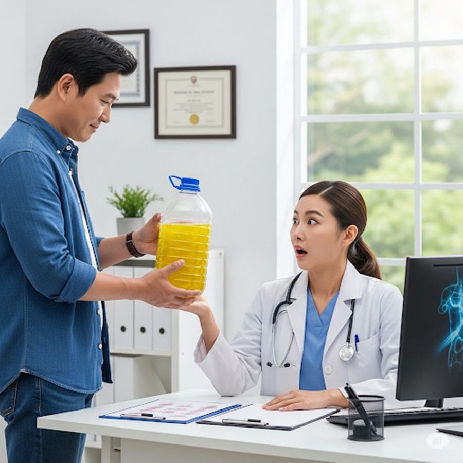 하지만 아저씨는 아랑곳하지 않았죠. 사실 아저씨는 자신만의 샘플을 가져온 것이 아니었습니다. 아내와 자녀들까지, 온 가족의 소변을 한 병에 섞어서 가져온 것이죠. 아저씨는 이 한 병으로 온 가족의 건강을 한 번에 확인하고 싶었던 겁니다. 이 예상치 못한 스케일에 의사는 당황했지만, 이왕 가져온 것이니 검사를 진행하기로 했습니다.